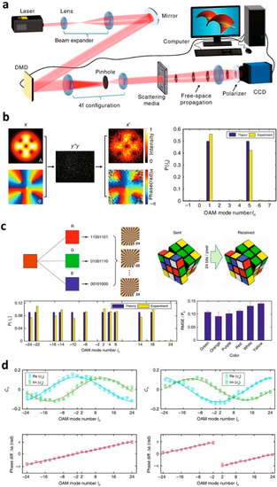 Gong et al. have demonstrated OAM demultiplexing in a severe scattering environment based on the SSM [79]. In the experiment, OAM states generated by the digital micromirror device are scattered by the media (Figure 7a). The free-space propagation of the scattered OAM states generates a speckle pattern at the image sensor. By exploiting the SSM, Gong and colleagues successfully recovered the input OAM states from the speckle image. The estimated weights for OAM states exhibited good agreements with the correct values with an error rate of less than 10% for monochromatic light (Figure 7b). This is in contrast with holographic demultiplexing, wherein the demultiplexing fails even for small misalignment. Further experiments have demonstrated successful data transfer of monochromatic and colour images based on binary amplitude modulation of OAM states (Figure 7c). Finally, they measured the relative phase between OAM states, and showed benefits in coherent optical communication systems (Figure 7d). Although a strong scattering environment is assumed in [79], it is possible to extend the OAM demultiplexing to a weak scattering environment by placing scattering media near the detection region. To implement the demultiplexing method in a dynamic environment such as in the presence of atmospheric turbulence or the perturbations of an optical fibre, rapid calibration of the TM is necessary.