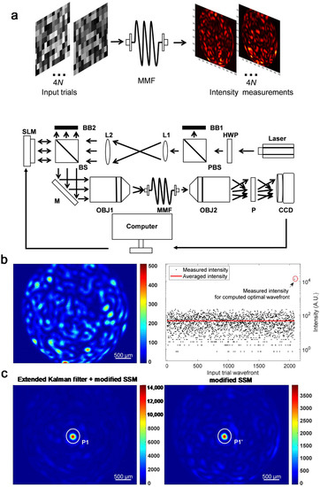 Huang et al. refined the result of the SSM using an iterated extended Kalman filter, wherein the measurement error induced by Gaussian random noise is minimized via an iterative algorithm (Figure 8a). Numerical simulation revealed that L = 4N modulations for N input modes result in a correct TM from which ideal wavefront shaping performance is achieved (Figure 8b,c). In an experiment with a multi-mode fibre, the TM was successfully measured, and enhancement of the focal intensity of 286 (P1 in Figure 8c) with 520 input modes was achieved. Without the extended Kalman filter, the achieved enhancement was 76 (P1′ in Figure 8c). This work demonstrates that the SSM can be utilized in other linear systems to measure signals, other than holographic images.