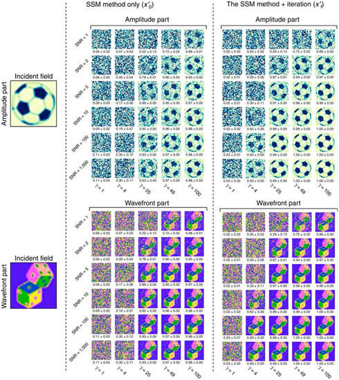 In practice, the limited signal-to-noise ratio of image sensors, the deviation of the TM from the complex Gaussian distribution, and the limited oversampling ratio lead to an error in the SSM. To address these issues, an iterative algorithm can be employed. In this section, the Gerschberg–Saxton type iterative algorithm in [36] is introduced. First, the retrieved field is multiplied by the TM to obtain the transmitted field , where the subscript n is the number of iterations. The amplitude of is then replaced with the square root of the measured intensity to yield an updated approximation of the transmitted field . By applying the pseudoinverse of the TM to , an updated incident field is obtained. The entire process is repeated until no significant change of x is made between iterations. The algorithm quickly converges and provides the exact solution, even for a small oversampling ratio () [36], without imposing assumption or regularization parameters. The numerical solution shows that the algorithm is slightly more effective for the phase component than the amplitude component of an image for the same SNR and the same oversampling ratio (Figure 9). The effectiveness of the iterative algorithm is maintained when multiple incoherent input modes are considered (Figure 10a–d) [67].