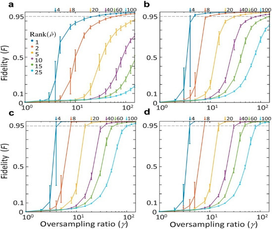 (a–d) The performance of the algorithm as a function of the rank of the SSM with SNR of 10 (a), 100 (b), 1000 (c), and infinity (d). The fidelity (F) is defined according to [92] and given by , where Z0 and Z represent the prepared and measured states, respectively. Adapted with permission from [67], APS.
