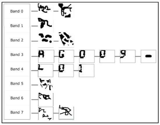 - The match is negative. The shape indicated by the shape index is merged—temporarily—with the following shape and the merged shape is compared with the list of morphologies resulting from step 5 (see Figure 11b): First case; If this is a positive match, then it is considered that the two shapes are in fact fragments of the same character. We move the shape index to the following unexamined and unmerged shape. We select the next expected character by moving the expected character index to the next position and return to step 5. Second case; If it is negative, we assume that the source character is noise and move the shape index to the next shape within the current band (see Figure 11c). If the shapes remaining in this band are still sufficient for validation of the expected characters remaining on this line then we return to step 6. Otherwise we return to step 2.