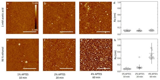 (a–c,e–f) A set of six AFM topographs of silicon oxide substrates silanized with APTES. The substrates are silanized using either 96% ethanol or 1 mM acetic acid as the solvent and the APTES concentration is varied from 1% to 4%, as indicated in the figure. The height scalebar for all topographs is shown in Figure 1a. Lateral scalebars are 1 µm. (d,h) The average surface roughness of silanized substrates prepared similar to the topographs in (a–c) and (e–f). The average is calculated based on four separate areas imaged on each of four samples prepared for each combination of solvent and APTES concentration parameters.