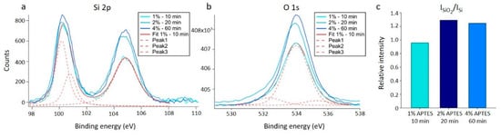 XP spectra results for crystalline silicon silanized with APTES using acetic acid as the silanization solvent. (a) Si 2p spectra. (b) O 1s spectra. (a,b) The results are displayed with the curve fitting results for the 1% APTES, 10 min silanization sample, which consisted of three separate peaks that combines to the overall fitted curve (Fit 1%—10 min). Similar curve fits were performed for the two additional silanization conditions, but the fitted curves to the data are not included in the graph. (c) Bar plot showing the relative intensities of the SiO2 peak at ~104.8 eV to the bulk silicon peak at ~100.5 eV. Results are calculated based on the fitted curves.