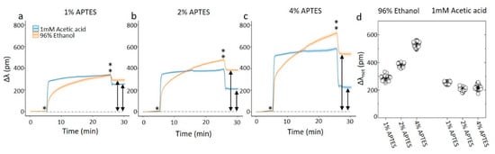 The silanization processes using the two different solvents for the APTES were also performed on ring resonator sensor chips on the Genalyte system (Figure 3). In comparing the data, one should be aware that the silanization process as monitored by the ring resonator sensor chip differs from the process used to obtain the data above since the silanization solution is flowing over the chips at constant flow rate while the signal is recorded. The procedure consisted of a solvent rinse, followed by exposing the ring resonators to the silanization solution for 20 min, followed by a second solvent rinse, all at the same volumetric flow rates. The shift in the resonance data show different signatures when using 1mM acetic acid as the solvent as compared to 96% ethanol. For the 1 mM acetic acid solvent, the change in resonance frequency is initially quick, followed by a less rapid increase. The change in resonant wavelength, Δλ, from the flushing of the solution to the solvent in the second rinse is almost instantaneous, and its magnitude is reflecting the impact on the contribution to the refractive index in the solvent from the APTES on Δλ. The net resonance shift Δλnet in the final rinse compared to the initial rinse, is (252 ± 8) pm for the 1% APTES, 10 min treatment, changing to (206 ± 11) pm and (218 ± 15) pm for the increasing CAPTES and durations, e.g., in the order of 210–250 pm without any clear overall trend for all the three CAPTES. The Δλ shift from the solution to the final rinse is proportional to the CAPTES.