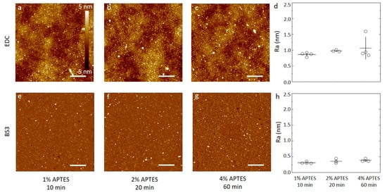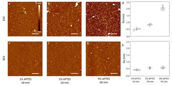 (a–c,e–f) AFM height topographs of anti-CRP antibodies immobilized on silicon substrates silanized using APTES dissolved in 96% ethanol. (a–c) Height topographs of anti-CRP immobilized by carbodiimide chemistry (EDC) to substrates silanized using APTES concentrations and durations of (a) 1% APTES, 10 min, (b) 2% APTES, 20 min, and (c) 4% APTES, 60 min. (d) The average surface roughness obtained from 5 µm × 5 µm AFM topographs (n = 4, for each condition) of anti-CRP immobilized on silanized silicon. (e–f) Selected AFM height topographs of anti-CRP immobilized using the BS3 linker to silicon substrates silanized using APTES concentrations and durations of (e) 1% APTES, 10 min, (f) 2% APTES, 20 min, and (g) 4% APTES, 60 min. (h) The average surface roughness obtained from 5 µm × 5 µm AFM topographs (n = 4, for each condition) of anti-CRP immobilized using BS3 on silanized silicon substrates. The height scalebar for all topographs are shown in Figure 4a. The lateral scalebars on the AFM topographs are 1 µm.