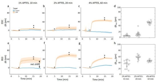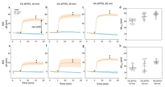 For the chips silanized using ethanol as a solvent and EDC as the coupling agent (Figure 7a–d), the 10 min and 20 min duration of the silanization and subsequent immobilization of anti-CRP yielded chips that display far less shift when exposed to CRP. Changing the duration to 60 min and 4% APTES and subsequent EDC catalyzed immobilization, yielded chips displaying a net shift of about 50 pm when exposed due to CRP. This is about 60% of the binding capacity of the chip prepared using acetic acid as the solvent and identical silane concentration and duration. In other words, when using ethanol as the silanization solvent in combination with EDC, it is only the roughest surfaces that results in a substantial protein capture on chip. For the BS3 coupling agent used for the silanized surfaces using ethanol as the solvent, we observe an apparent non-monotonic change in the relative wavelength shift with increasing duration and concentration of the silane (Figure 7e–h). For the CAPTES = 1% applied for 10 min, the parameter Δλnet for the CRP capture was observed to 37 pm. The ring-resonator readout increased to Δλnet = 60 pm for CAPTES = 2% applied for 20 min, which was subsequently reduced to Δλnet = 48 pm for CAPTES = 4% applied for 60 min. Although there is some experimental uncertainty, the overall trend of this non-monotonic readout appears significant.