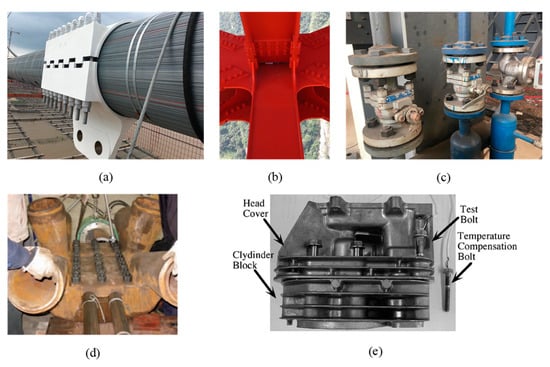 Applications of prestressed bolted connections. (a) Main cable clamp in a suspension bridge. (b) Steel truss structure. (c) Flange. (d) Joint of cable-supported structure [6]. (e) Engine head joint [8].