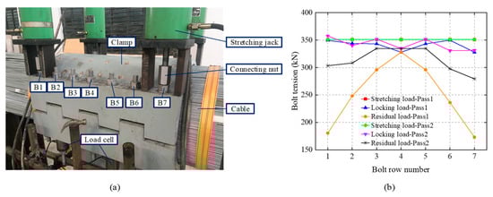 Interaction effect of the cable clamp bolts of a suspension bridge in an alternately fastening process. (a)Experimental set-up. (b) Alternation of tension force of the bolts during two passes of fastening from sides (bolt B1 and B7) to middle (bolt B4).