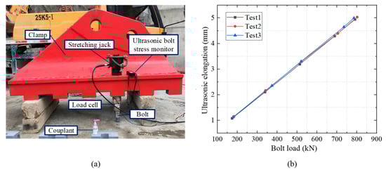 Figure 3 shows a calibration test (conducted by the authors) for the factor of the high strength bolts used in a cable clamp designed for a suspension bridge. The bolts were fabricated of 40 CrNiMoA steel, with a diameter of 52 mm and a length of 850 mm. The tests were implemented under a constant temperature. The linear relationship between the bolt load and the measured ultrasonic length is presented in Figure 3b. Similar linear relationships were validated by other research [25,26,27,28].