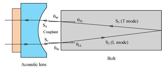 Kim and Hong [42] added a spherical acoustic lens between the transducer and a bolt head to induce the mode-converted longitudinal incident ultrasonic wave (LL mode) refracted from the front interface of the bolt head and the mode-converted shear wave (LT mode) reflected from the rear interface of the bolt. Figure 4 shows the ray path of a mode-converted ultrasonic wave in a 15 mm length bolt when the acoustic lens is used. The wave LT is subjected to both longitudinal and transverse wave velocity, therefore producing a delay relative to the wave LL. Two echoes are easy to distinguish in the time domain. Theoretical expression of the bolt stress is given by,