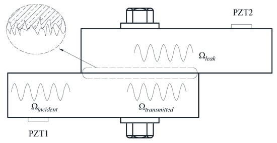 The wave energy attenuation (dissipation) method belongs to the linear method because the theory of the method assumes that the contact stiffness (i.e., the extent to which the interface resists deformation in response to a contact force) of the bolted connection system is linear [11]. Figure 5 illustrates the elastic wave propagation in a bolted joint. When the incident elastic waves carrying energy () propagate through the connected area of the bolted joint, some waves carrying energy () will leak through the real contact area () and the rest of the waves carrying energy () continuously transmit in the original connection member. The energy attenuation method assumes that the leaky or dissipated energy of the waves is proportional to the true contact area (). According to the classical Hertz contact theory, the true contact area S and the contact pressure P have a relationship . Thereby, the attenuated energy of elastic waves correlates with the contact pressure (i.e., the bolt clamping force) [11]. Yang and Chang [52,53] experimentally validated the energy attenuation phenomenon of the transmitted waves in a prototype apparatus and in a real bolted joint used to connect C–C composite thermal protection plates to the host structure. In order to measure the wave energy, Amerini and Meo [54] developed the first-order acoustic moment index , defined as: