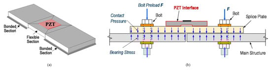 In recent years, development of PZT impedance-based wearable devices has drawn much attention. By embedding a PZT patch in a washer, a smart washer was developed to evaluate bolt loosening through impedance frequency analysis [97,98,99]. For instance, Wang et al. [99] designed and fabricated a wearable PZT impedance device to monitor the tightness of a 12-bolt subsea flange. As shown in Figure 6, a small aluminum plate boned with a PZT patch composed of a monitor device was developed by Huynh et al. [100]. The aluminum plate is comprised of two boned sections on two sides and one suspending section in the middle, which makes it able to produce a unique vibration. The device was used to evaluate the bolt tightness of a connected plate as shown in Figure 6. The electrical-mechanical impedance (EMI) function was derived. Using the software COMSOL Multiphysics, finite element simulation was performed to pre-ascertain the sensitive frequency band of the peak impedance of the tested system. The experimental results showed that the trend of resonance frequency and the real impedance peak value with respect to the loose bolt agreed with the analytical results.