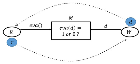 Therefore, to eliminate concerns, a blockchain network, comprising many miner nodes M, is responsible for evaluating d, denoted by eva(d), and to pay the workers automatically and mandatorily if d meets the requirement, that is, eva(d) = 1. However, because of the openness and transparency of d stored in the blockchain, everyone can access d as soon as W uploads d to the blockchain. Here, the problem is that R can also act as a M or can control a M to access d before executing eva(d). In this case, a malicious R can create and publish an abnormal eva() that always ensures eva(d) = 0. This represents an example of unfair dealing because R receives d without losing r, but W loses d without receiving r.