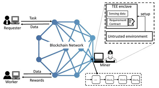 Four main parties are involved in the system shown in Figure 2, these are miners, requesters, workers and a blockchain network. Miners are in charge of collecting, validating transactions and creating blocks for the blockchain. They gain mining rewards and transaction fees if they succeed in creating a block. A miner can become a requester to publish tasks or a worker to complete tasks. A miner node consists of two parts mainly, an untrusted environment and secure TEE enclaves. Requesters, who need sensing data, publish a task to the blockchain. They pay workers who can upload sensing data to the blockchain if the data meets their requirements. A task consists of a reward deposit and a sensing data requirement that is codified as a smart contract (i.e., chain code). Workers are persons who accept the task published by requesters in the blockchain. They collect sensing data by using specified mobile devices and upload the data to the blockchain, and then receive rewards. In our system, the blockchain network, consisting of a great many miner nodes, provides a crowdsensing service, responsible for executing evaluation eva(d), executing reward payment, and storing sensing data.