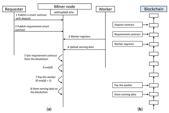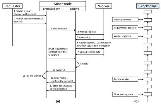 Figure 3 shows the operations of our proposed crowdsensing scheme. (Steps 1–2) The requester submits a smart contract with a deposit before publishing a requirement contract eva() to the blockchain. The deposit represents the reward r to guarantee that the requester is able to pay workers if eva(d) = 1. (Steps 3–7) Then, a secure enclave is set up by the untrusted environment in the miner node. The worker performs remote attestation [27] with the enclave residing on the miner node to gain confidence that the intended software is securely running within an enclave on a TEE enabled platform. If the attestation passes, the worker establishes secure communication with the enclave through the TLS connection and uploads sensing data to the enclave. The enclave concurrently gets the requirement contract published by the requester from the blockchain. (Steps 8–11) The miner node executes the requirement contract with the sensing data (i.e., eva(d)) inside the enclave to evaluate the data. If the data meet the requirements, the enclave outputs 1 (i.e., eva(d) = 1) to the untrusted environment of the miner node, which is responsible for paying rewards to the worker using the requester’s deposit. Otherwise, if eva(d) = 0, the enclave deletes the sensing data and terminates the transaction. (Steps 12–13) After a period of time t, the enclave validates the payment and stores the sensing data in the blockchain. The value of time t is a parameter that depends on the blockchain security strategy, for example, 60 min in Bitcoin. Finally, if payment validation fails, the enclave will delete the data and terminate the transaction.