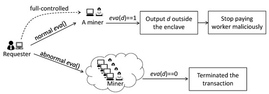 The payment validation (i.e., step 12 in Figure 3), which occurs before storing sensing data outside the safety boundary of the enclave, is very necessary. Otherwise, malicious requesters can perform the following type of trick (Figure 4). First, the requester publishes an abnormal requirement contract (i.e., eva()) to the blockchain network. This requirement contract always returns eva(d) = 0, causing the nodes in the blockchain network to not pay the worker. However, then, the requester creates a new but normal eva() and fully controls one miner node to execute this eva(). If eva(d) = 1, the sensing data d will be stored outside the enclave as expected. Since the requester can fully control the miner node, it can access the sensing data as soon as they are outputted from the enclave, then it stops paying the worker once the data are accessed. In this case, the worker loses their sensing data without being rewarded. Therefore, it is necessary to verify the reward payment before storing the data outside the safety boundary of the enclave.