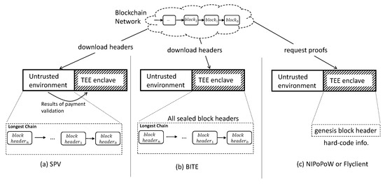 Payment validation approaches performed by enclaves. (a) Simplified Payment Verification (SPV) downloads all block headers from the blockchain network and maintains them in the untrusted environment. The TEE enclave gets results of payment validation from the untrusted environment. (b) Bitcoin Lightweight Client Privacy using Trusted Execution (BITE) also downloads all block headers from the blockchain network. However, it maintains them inside the safety boundary of the TEE enclave via a sealing technique. Thus, the enclave can validate payments itself. (c) Non-Interactive Proofs of Proof-of-Work (NIPoPoW) or Flyclient only requests proofs from the blockchain network. They do not need to download and maintain all block headers locally. The genesis block header (i.e., the first header of a blockchain) is hard coded in the enclave to help verify the proofs.