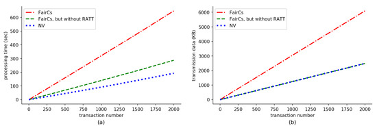 Furthermore, we calculate the average of processing time and communication transmission data for each transaction to demonstrate the performance influence of using TEE. Figure 8 shows the results. Our FairCs equips the components of TEE and RATT to guarantee security. In Figure 8, the label “FairCs_without_RATT” means the case that FairCs does not equip the component of RATT; the label “only_RATT” means the time or transmission data size is brought in by only RATT. We calculate their total processing time and transmission data size over 2000 transactions by using the way mentioned in the previous paragraph, and further divide them by 2000 to get their average values. The results show that the processing time and network transmission data of the part where we only use RATT is greater than the other two, which summarizes that RATT creates the most performance overhead of FairCs when compared with NV.