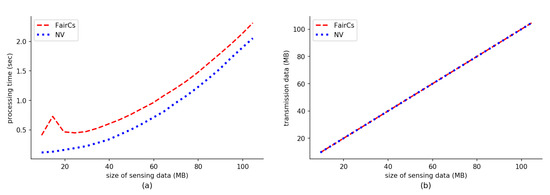 Evaluation results of the system performance with different sizes of sensing data. (a) Processing time of FairCs and NV. (b) Network transmission data size.
