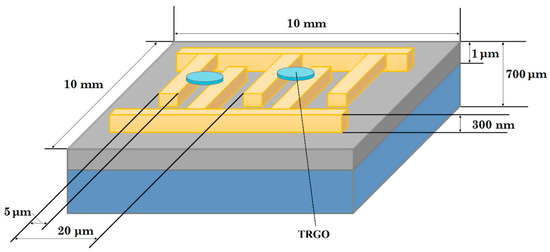 The structures were prepared in the following way: (i) graphene oxides (reduced/exfoliated graphene oxide prepared as described above) were mixed with ethanol (ETHYL ALCOHOL ABSOLUT 99.8% PURE P.A., POCH, Gliwice, Poland) using ultrasonic stirring for 15 min; (ii) the suspensions were applied onto interdigital transducers (IDT), with gold electrodes (on 2 nm of chromium layer) on SiO2/Si substrate, schematically presented in the Figure 1, using the drop coating method; (iii) the structures were then annealed at 200 °C in dry N2 atmosphere.