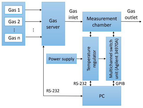 Resistance measurements were carried out at different gas mixtures composition, with different humidity level and different sample temperatures. The scheme of the gas measurement system is presented in Figure 2. The system enables to dosage a selected gas in a precise way and also creating the gas mixtures of the selected composition using gas server based on mass flow controllers. The gas was introduced into the measuring chamber with a stable gas flow of 500 mL/min. Several samples were placed in the chamber and the measurement were performed for each one at the same time (to preserve the same measurement conditions). The temperature of the samples was controlled by using a proportional-integral-derivative (PID) controller SR94 (Shimaden, Tokyo, Japan) while the resistance were measured using multi-switch unit 34970A (Agilent, Santa Clara, CA, USA). Data acquisition and measurement control was done using PC computer (LabVIEW software).