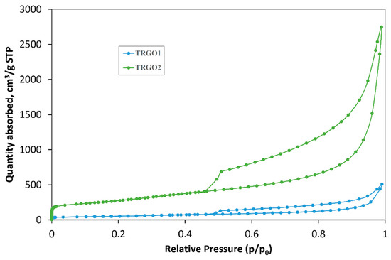 The porosity of TRGO1 and TRGO2 were investigated by the N2 sorption method at 77 K. Figure 3 shows the N2 sorption isotherms for these materials, and Table 2 gives the textural parameters determined on the basis of the isotherms.