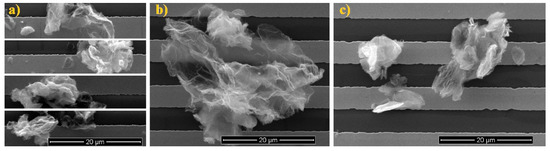 Both samples were characterized using SEM to determine how rGOs were arranged on the IDT transducers. In both cases, the embedded rGOs did not form a uniform layer, but agglomerates are formed and spread throughout the entire area. The diameter of the agglomerates was from 2 μm to 20 μm for both sensing materials.