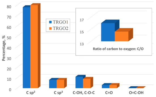 The materials mostly consist of carbon atoms with sp2 hybridization (78% and 80% for TRGO1, and 2, respectively). The atoms with sp3 hybridization constitute 8% in each case. Moreover, both oxides consist C-OH and C-O-C in amount of 11% for TRGO1 and of 9% for TRGO2. The quantity of C=O groups is the same for both oxides (3%), while O=C-OH groups are not present in any oxide. The amount of carbon relative to oxygen is 16.02 and 14.61 for TRGO1 and 2 respectively. This data were graphically presented at Figure 5 (detailed data about distribution of carbon and oxygen bonds for graphite oxide/thermally reduced graphene oxide and narrow-scans of C1s are in the Appendix A, designated as Table A1 and Figure A1, Figure A2, Figure A3 and Figure A4, respectively).