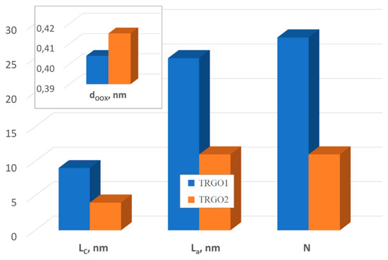The crystallite diameter (La), crystalline height (Lc) and number of layers (N) in a crystallite (Figure 6) are smaller and the interplanar distance (d00X band) are bigger in the case of TRGO2 (TRGO1: 25 nm, 9 nm, 28, 0.4040 nm, TRGO2: 11 nm, 4 nm, 11, 0.4151 nm). Diffraction patterns of graphite oxides and reduced oxides are in Appendix A: Figure A5.