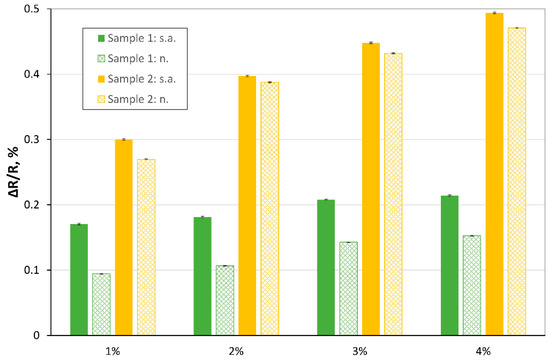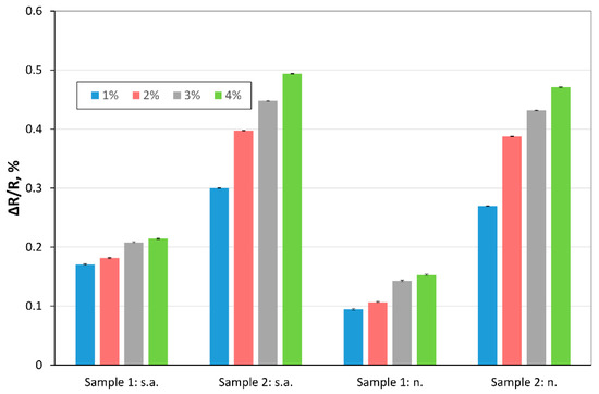 In the next experiments, we investigated the response of the samples to different concentrations of hydrogen (in the range of: 0–4%) in carrier gas. The measurements were performed at various temperatures. The ΔR/R vs. concentration of hydrogen is presented Figure 7 and Figure 8 (for 150 °C).