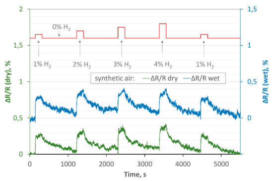 In addition, by analysing the data presented in Figure 9, it can be seen that the results are reproducible. We dosed hydrogen in a dry carrier gas in the following sequence of concentrations: 0, 1, 0, 2, 0, 3, 0, 4, 0, 1, 0% (we checked the stability of the results by repeating the measurements with 1% hydrogen at the end of the cycle). The obtained value for 1% hydrogen measured at the beginning and at the end of the dosing cycle is comparable.