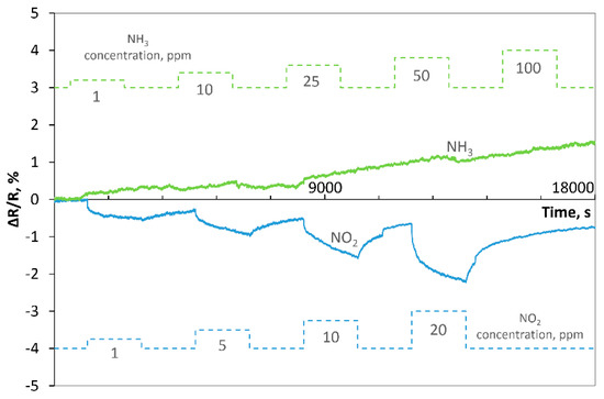 We performed additional experiments to review the sensitivity of the samples for two other gases, ammonia (NH3) and nitrogen dioxide (NO2), at 150 °C. The experiments were performed for various concentrations (5, 10, 25, 50 and 100 ppm) of ammonia in dry synthetic air. Both samples were slightly sensitive to ammonia in the ppm range; there were no evident changes in the resistance, but rather its insignificant increase similarly to the baseline drift. Completely reverse reactions of the samples compared to reducing gases (H2- Figure 9 and NH2- Figure 10) were registered during the reaction to oxidizing gas (NO2 at concentrations of: 1, 5, 10 and 20 ppm). When nitrogen dioxide was introduced into the atmosphere, the resistance of samples decreased, but the changes were much slower than in the case of H2. For example, for 1 ppm NO2 in dry synthetic air, the time trc estimated for Sample 1 was approximately equal 960 s, while for Sample 2, it was 1058 s. The regeneration time treg was longer for both structures (>30 min). For all tested concentrations, changes in the response (ΔR/R) were higher for Sample 2. The comparison of the results obtained for two structures with the same thermally reduced graphene oxide (TRGO2) is given in the Appendix A as Figure A7. This statement is intended to show the reproducibility of the method.