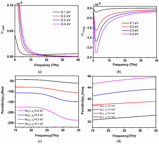 where is the permittivity of the dielectric substrate, and Vg is the bias voltage applied across graphene sheets. Figure 1a,b illustrate the real and imaginary part of graphene conductivity. Surface conductivity derived at µc = 0.1 is low; however, as the chemical potential is raised to µc = 0.4 eV, the conductivity obtained almost spans a wideband of frequency. Additionally, the increase in chemical potential provides tunable conductivity characteristics.