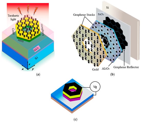 Proposed geometry of graphene-metal hybrid nanoantenna. (a) Top view of the graphene stack antenna, as the antenna is illuminated by THz light in the frequency range of 30–34 THz and is incident on the surface of antenna parallel to the z-axis, (b) layered view of the antenna structure, as the antenna structure is composed of eight-layers, i.e., three-layers of substrates, two graphene stacks, a gold layer, and graphene reflector, and (c) gating of the proposed antenna by applying a voltage across graphene sheets for the tuning of Fermi energy in the range of 0.1 eV–0.3 eV.