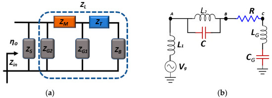In this section, the transmission line (TL) model and the corresponding RLC resonant equivalent circuit model are developed to analyze the performance of the designed antenna, respectively, in Figure 4a,b. Assuming the proposed graphene antenna as a coupled-resonator, the functioning frequency of the antenna is the resonance frequency of the proposed RLC equivalent circuit, as depicted in Figure 4b. The input impedance () governs the reflection and transmission coefficients of the antenna, according to TL theory. The Input impedance must be perfectly matched to the characteristic impedance () to obtain the resonance frequency of the circuit model. Input impedance is acquired with