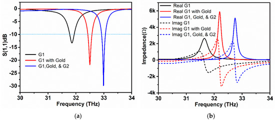 Figure 5b illustrates the real and imaginary impedance of the proposed antenna at the resonance point for the above-explained symmetries. Input impedance is the characteristic of an antenna, which provides a clear understanding of how well the designed antenna is matched with incident frequency. The solid lines depicted in Figure 5b represent the real part of the input impedance, while dashed lines depict the imaginary part of the input impedance, respectively. The input impedance with only one graphene stack is quite low when compared with graphene/gold and graphene/gold/graphene symmetry at the resonance frequency. The input impedance of the final stack configuration is lower than the graphene/gold symmetry due to the contact resistance effect of the graphene stacks with a gold layer. At 33 THz, the input impedance has a value of 5.2 K ohms by providing a better matching condition between the incident EM fields and the antenna. An excellent agreement between the reflection coefficient and impedance spectra can be observed from Figure 5a,b, which agree with the matching condition.