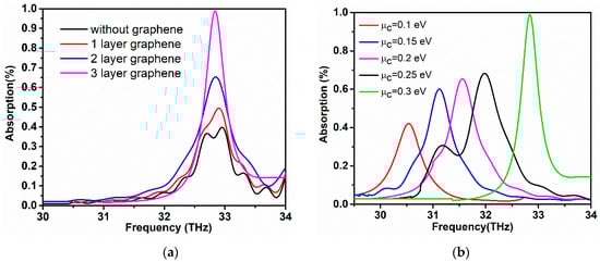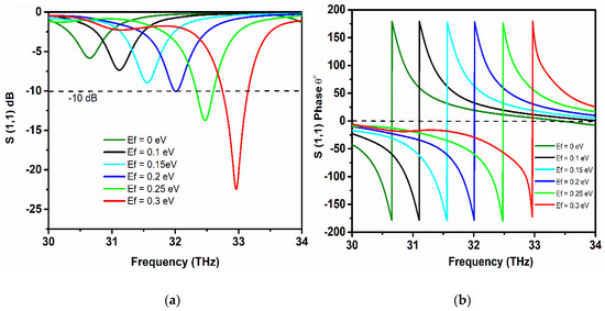 Chemical potential, which is also known as Fermi level (EF), plays a significant role in controlling the complex surface conductivity of graphene. The chemical potential of the graphene sheets is tuned in the range of 0 eV to 0.3 eV by applying external electrostatic gate voltage across the graphene sheet, as shown in Figure 2c. In this subsection, the resonance shift that is based on increasing the chemical potential with a step width of 0.05 eV to observe the resonance tuning and to achieve two times enhancement in operating bandwidth by setting the relaxation time 0.3 ps. The resonance frequency tuning is realized by varying gate voltage, which in turn increases the chemical potential of the graphene layers. The significant increase in the chemical potential tune the surface conductivity of graphene to higher frequencies, therefore, providing the tunability at a wide range of frequencies, starting from 30.6 THz to 33 THz. Figure 6a illustrates the resonance tunability of the proposed graphene-metal antenna with varying chemical potential. The reflection coefficient at 0 eV is less then –10 dB and the antenna resonates at 30.6 THz. However, the increasing chemical potential up to 0.15 eV the S11 is improved along with frequency tuning. At 32 THz, the resonance peak touches the −10 dB line, which ensures the antenna matching condition. This dramatic right shift of the frequency is directly related to the chemical potential of graphene layers in stacks. Additionally, the S11 resonance peaks accomplish better values as the chemical potential raises. With the chemical potential of 0.3 eV, the antenna attains the resonance peak with S11 of −23 dB at 33 THz. It should be noted that the value of S11 at 0.3 eV in Figure 6a is less than the values attained in Figure 5a because the thickness of the substrate between the graphene first graphene stack and graphene reflector is varied to 1um. The effect of fringing fields between the graphene stack and metal reflector is minimized due to increasing substrate thickness, thus resulting in the improvement of bandwidth. The -10dB bandwidth at 0.3 eV with 1 um substrate thickness is 0.6 THz, which is almost double than the previous one with a substrate thickness of 0.5 um, respectively.