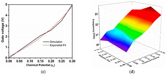 Figure 6b represents the respective phases of S11 at the resonance frequencies with varying chemical potential, as the resonance frequency shift rightwards, the phase of S11 also tune to the resonance position. Figure 6c depicts the tuning response of the chemical potential with increasing gate voltage, which undoubtedly depicts that varying gate voltage linearly increases the chemical potential of graphene. The black line represents the calculated chemical potential values with variable gate voltage from the simulation, while the red dash line is the exponential fitting of the calculated values gate voltage versus chemical potential. Furthermore, the effect of varying chemical potential with increasing, relaxation time on the resonance frequency can be examined from Figure 6d. It can be observed that, when the chemical potential value of graphene layers remains constant and the relaxation time is varied from 0.1 ps to 0.4 ps, a very small shift of resonance frequency is observed. However, a better impedance matching condition is reflected when the relaxation time is set 0.4 ps with a high value of S11. In contrast, when chemical potential is varied, the graph shows an inclined behaviour of the resonance frequency. Thus, the tunability of the proposed antenna mainly depends upon the chemical potential of the graphene layers.