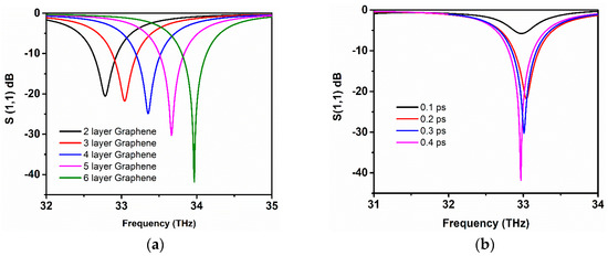 The performance of the designed graphene-metal antenna is investigated with respect to the antenna geometric parameters and other graphene properties. Firstly, the S11 parameter and resonance frequency are studied. A dramatic shift of resonance towards higher frequencies with increased S11 values were observed as the number of graphene layers in a stack is increased to six layers of graphene. The highest resonance peak is attained at 34 THz with S11 of −42 dB when the stacks of the antenna are composed of six layers of graphene, as shown in Figure 7a. However, increasing graphene layers can affect the radiation efficiency and EM wave confinement due to the low coupling of graphene plasmons with metallic plasmons and the increase of interlayer resistance between the graphene sheets. Although, the addition of more layers can significantly increase the absorption of the antenna along with the tuning of the resonance frequency. In Figure 7b, the behaviour of S11 parameter; the relaxation time, which is known as the scattering rate of the graphene, has been observed to increase. This property of graphene improves the resonance peak by achieving higher reflection values while the frequency remains static. At minimal value, the relaxation time decreases the S11 peak. However, by increasing the value of relaxation time to 0.4 ps, the reflection peak accomplishes sharp resonance at 33 THz with S11 of almost −42 dB. As can be observed from Figure 7b, a higher value of relaxation time helps in improving the operational bandwidth of graphene antenna, but a very small shift can be observed in the frequency towards lower frequency. It should be noted that the graphene antenna that was investigated in this article has a relaxation time of 0.3 ps.