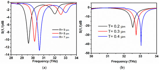The metallic part of the antenna plays a significant role in the operation of the graphene antenna. Normally, metallic antennas have a broad range of operating frequencies due to the interaction with incoherent diffraction along the edges and corners. The surface plasmons dthat propogate along the edges and sharp corners of the metal patch can produce highly EM field confinement, which can be exploited in the application where near-field interaction is needed. The hexagon symmetry with a center slot is adopted to achieve better EM field confinement. It is challenging to attain tunable performance when metallic antenna geometry matched to fix frequency, as the conductivity of metals cannot be tuned like tunable graphene conductivity with an increasing chemical potential. The tunability of the metallic plasmonic hexagon resonator is possible by altering its size. The proposed antenna has a gold hexagon having a radius of 6 um with the center slot of 2 um in radius. The effect of antenna’s performance is analyzed by increasing the radius of the metallic hexagon. Figure 8a shows that, as the antenna’s size increases, the proposed antenna’s surface plasmon resonance resonates at lower frequencies. This validates the inverse relation of the antenna’s length and the resonating frequency. As the radius of a hexagon is set to 7 um, the antenna resonates at 30.6 THz, which is far lower than the target frequency, but also possesses dual-band operational resonance frequency. The dual-band resonance is realized when the size of the antenna is increased, and the inductance also rises, which in turn increases the electrical length, resulting in multiband resonance. Here, the antenna radius is varied from 0.7 um to 0.9 um, and the resonance frequency has shifted to 29.5 THz. The operating frequency shifts leftwards to lower frequencies as the size of the antenna becomes larger. However, the second band at higher frequency has low impedance matching because of the low S11 value. Figure 8b illustrates the resonance tuning of the antenna when the thickness of the gold layer is changed. The resonant length decreases when the thickness of the metallic layer is increased. Essentially, it could be explained by the interference of two group waves. One type directly reflects from the surface while the other is captured by the metallic cavity when the EM waves propagate on the metallic hexagon radiator patch. This type of wave results in the shifting of the resonance frequency. As the thickness increases, the phase difference between these two types of group waves also increases, which further results in the spilling of radiation fields from the metallic patch and, hence, increases the resonant length. Figure 8b clearly shows the effect of increasing metallic patch thickness. As a result of increasing resonant length, the antenna resonance shifts rightward to high frequencies.