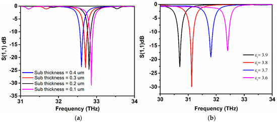 Figure 9a demonstrates the effect of changing substrate thickness on resonance frequency, as the thickness is varied, the resonance of antenna redshifts in the lower frequency range with a shift of 0.1 THz. The increase in the thickness of the graphene antenna substrate minimizes the fringing fields and induces EM radiation with better efficiency. However, the resonance peak moves leftwards with a decrease in S11 value with the increases in thickness. Figure 9b depicts the proposed antenna performance with respect to the change of the dielectric permittivity. The dielectric permittivity of the SiO2 substrate in the designed antenna is εr = 3.5. The effect of increasing dielectric permittivity of substrate material on the frequency response of the graphene antenna is investigated through simulations. It is obvious from Figure 9a, that, by increasing the permittivity of the substrate, the resonance frequency has a redshift and similarly achieves sharp resonance at lower frequencies as the permittivity raises.