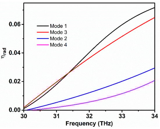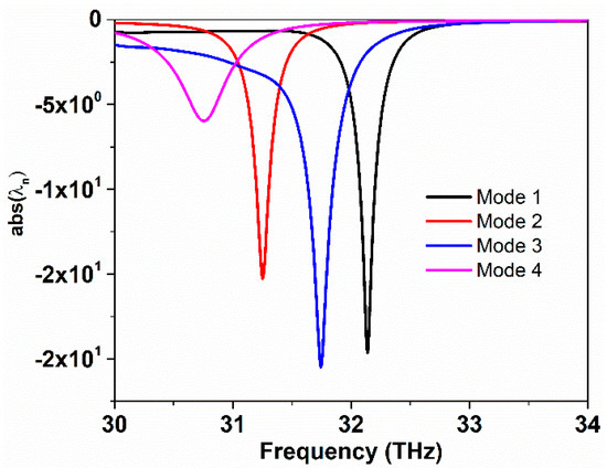 Four different modes are studied in order to analyze the characteristic modes of the proposed graphene-based antenna. The first and third modes are excited by TM polarized waves i.e., propagation vector normal to the antenna surface (x-polarized). While the second and fourth modes are excited with the same waves, but with the wave vector propagating parallel to the antenna surface (y-polarized). Figure 10 illustrates the characteristic mode analysis of the proposed graphene antenna with a relaxation time set to 0.4 ps. The odd modes are x-polarized and they have the resonance frequency higher than even modes. The excited four modes have resonance frequencies at 32.2, 31.2, 31.8, and 30.8 THz, respectively.