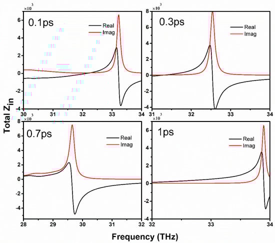 Relaxation time is one of the fundamental properties of graphene material, which represents the Fermi level and electron scattering rate of graphene. In this part, the performance of the proposed antenna, i.e., coupling coefficient and quality factor based on the equivalent circuit model with various relaxation time is analyzed. The relaxation time range 0.1 ps to 0.4 ps is considered, because higher values of relaxation time result in higher impedance, which degrades the antenna efficiency and produces mismatching. As mentioned earlier, in Figure 7b, 0.1 ps relaxation time results in the lower magnitude of S11 value due to impedance mismatching. However, higher values of the relaxation time result in sharper resonance magnitude.