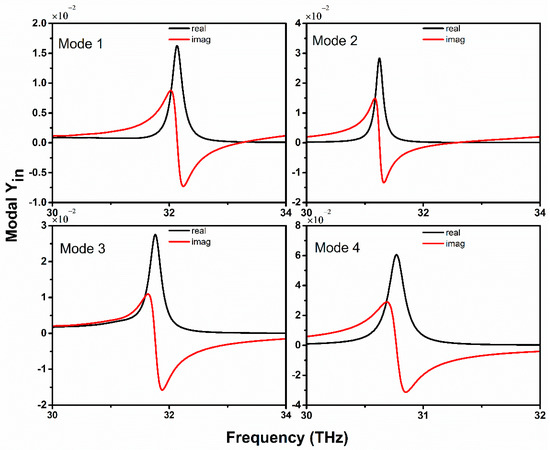 where Jn represents the associated eigenvector, ln is the eigenvalue, and n is the modal number, X = Xr + Xl is the imaginary part of the impedance Z. In Equation (34), the dissipated and radiated contributions are denoted by subscripts l and r. The dissipation impedance matrix Zl describes the complex surface conductivity of graphene. Similarly, the modal input admittance can be expressed with respect to the characteristic current [54], as follows