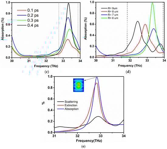 Figure 14c shows the absorption spectra related to the increment of graphene relaxation time. Surprisingly, the absorption becomes higher as the relaxation time is increased. Additionally, the absorption spectra are less tunable when relaxation time is set to a higher value. At 0.1 ps, 30% of absorption is achieved by the antenna; however, at 0.4 ps, the absorption spectrum reaches to maximum, i.e., 100%. On the other hand, the lower relaxation time shifts the resonance spectrum to a higher frequency, with the absorption peak being centered at 33.4 THz. The optical absorption of the graphene-metal antenna can be controlled and tuned by varying the gold hexagon size. Figure 14d shows the absorption spectra that were related to the increasing radius of the metallic hexagon. The redshift of absorbance spectra occurs primarily because of the increasing size. However, the peak of absorption spectra drops with a larger size, and the absorption bandwidth has shown increment. The metallic part in graphene antennas can produce small tunability but it can significantly decrease the absorption at the absorption resonance relatively to match the graphene-metal antenna structure. Moreover, to acknowledge the stacked structure being responsible for the unity absorption at the resonance frequency (33 THz), the absorption spectra are compared with the stacked antenna extinction and scattering responses. Figure 14e illustrates the comparison of the absorption, extinction, and scattering simulated response under the normal incidence of the incident light. It can be observed that the stacked geometry largely absorbs the incoming incident light. However, a small fraction of light results in scattering, which is relatively far lower than the magnitude of absorption.