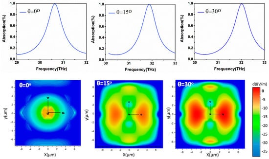 Absorption tuning and the corresponding E-field distribution to incidence angles 0°–30°.