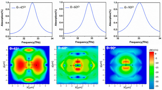 Secondly, the incidence angle range of TM y-polarized waves is set from 45° to normal incidence (i.e., 90°, with the aim of analyzing the tuning ability of absorption resonance. From Figure 16, it can be observed that when the incidence angle is set to 45°, the resonance peak of absorption becomes very near to the target frequency, but the bandwidth of the absorption remains the same as with the previously explained behavior of the antenna with a lower incidence angle. Significantly, as the incidence angle is moved near to normal incidence, the antenna exhibits extreme EM confinement, with surface plasmons propagating from the edges to the center gap of the antenna along the x-axis direction. A highly localized EM confinement is acquired with an incidence angle of 60° at 33 THz. The strong near-fields that are generated from the surface plasmons propagation along the gold layer give rise to plasmonic modes that start traveling from the edges of the antenna towards the center gap and strongly interact with the graphene plasmons. It can be noted that the stack configuration, containing graphene stacks, a gold layer, and the substrate layer acts as a slow-wave cavity. Therefore, the enhancement in the EM field on the surface of the graphene stack results from the reduction of incident waves group velocity.