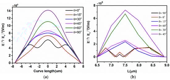 In Section 5.5.1, the discussion is more focused on the absorption tunability, and electric field distribution across the antenna geometry due to surface plasmons propagation. However, in this section, the investigation is generally on the enhancement of the electric field along the center gap and on the surface of the antenna with different incidence angles. The electric field enhancement factor can be defined as the ratio of electric field intensity on the graphene antenna surface to the incident light source. It must be noted that the enhancement factor of the electric field is independent of the power enhancement on the surface of graphene. It can be observed from Figure 17a, that, when the incident angle of the light source moves towards normal incidence, the strength of the electric field in the center gap rises sharply to 14 × 105 V/m. The strength of the electric field is analyzed by placing a complete curve around the antenna gap. The enhancement of the electric field is due to the excitation of graphene and metal plasmons and their propagations along the antenna surface, until it reaches the maximum value at the center gap. However, the behavior of electric field enhancement is very different across the whole antenna surface. The electric field intensity at the antenna edges is maximum when the incidence angle of the illuminating source is 30° and 45°. On the contrary, the enhancement of the electric field moves towards the antenna center and at the corners by setting the incidence angle at 0° and 90°, and the field becomes too weak.