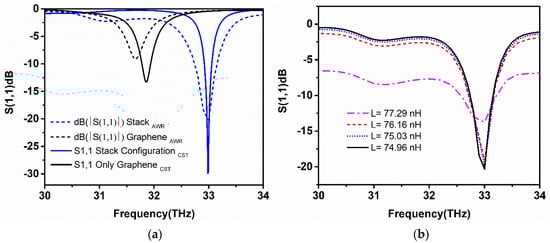 The graphene-metal plasmonic antenna has been excited with plane wave having a frequency range of 30–34 THz, in investigating the characteristic performance of the proposed graphene-metal stack antenna. The parametric optimization of the graphene and the corresponding frequency responses are obtained while using Finite-difference time-domain (FDTD) solver in the CST studio. In achieving better results, the mesh grid in numerical simulations is set to the minimum cell size of 0.02 um, therefore, generating a fine mesh across the geometry. Furthermore, in the RLC equivalent circuit that is illustrated in Figure 5b, the parameters are extracted by designing and optimizing the circuit using the software package AWR design environment. Additionally, the investigation is carried out by altering the L and C values in the proposed circuit to analyze their effect on the resonance frequency and quality factor. The simulation results obtained from the CST studio are compared with the RLC circuit to validate the proposed model.
