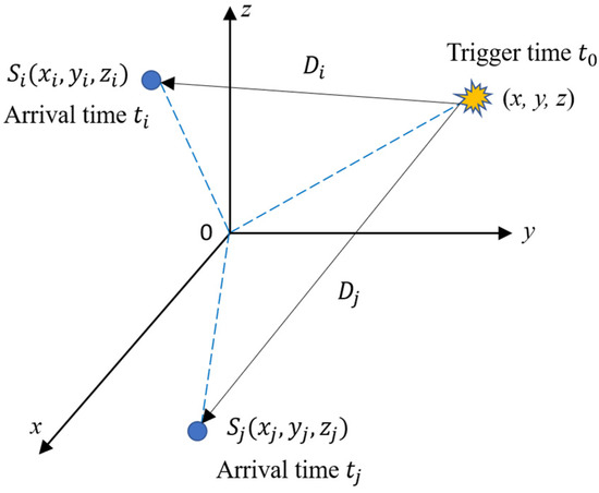 where denotes the distance between the AE source and the AE sensor, , and its expression is . is the arrival time of the sensor , is the trigger time of the AE source, and is the average wave velocity.